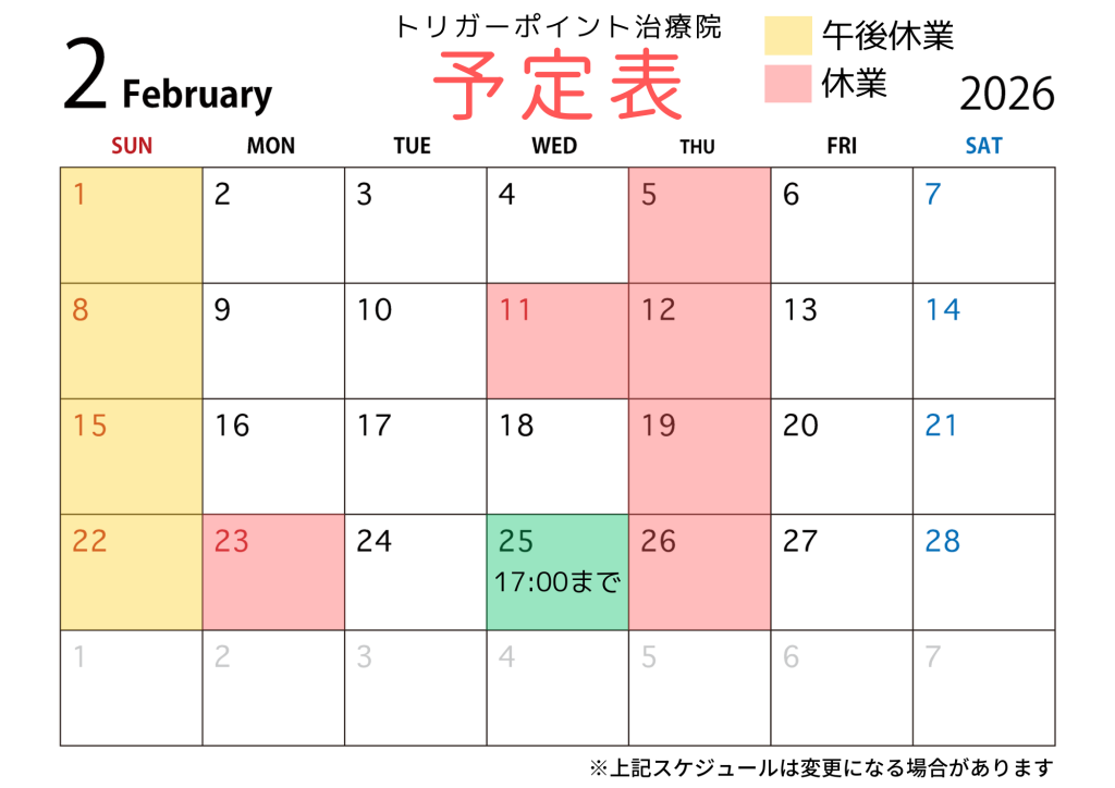 トリガーポイント治療院2月のカレンダーです。